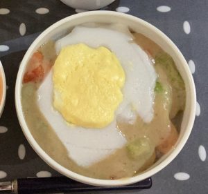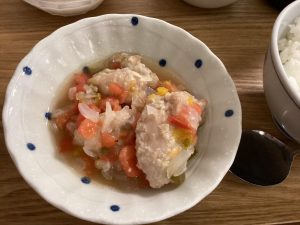 7月【ブラジル】鶏肉のモーリョソース 鶏肉に甘酸っぱい野菜ソースがかかっています。