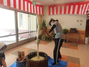 こんにちはグループホームの0です。1月13日に餅つきを行いました。餅が柔らかく杵にくっついて、長く伸びました。ついた餅は、美味しく頂きました。